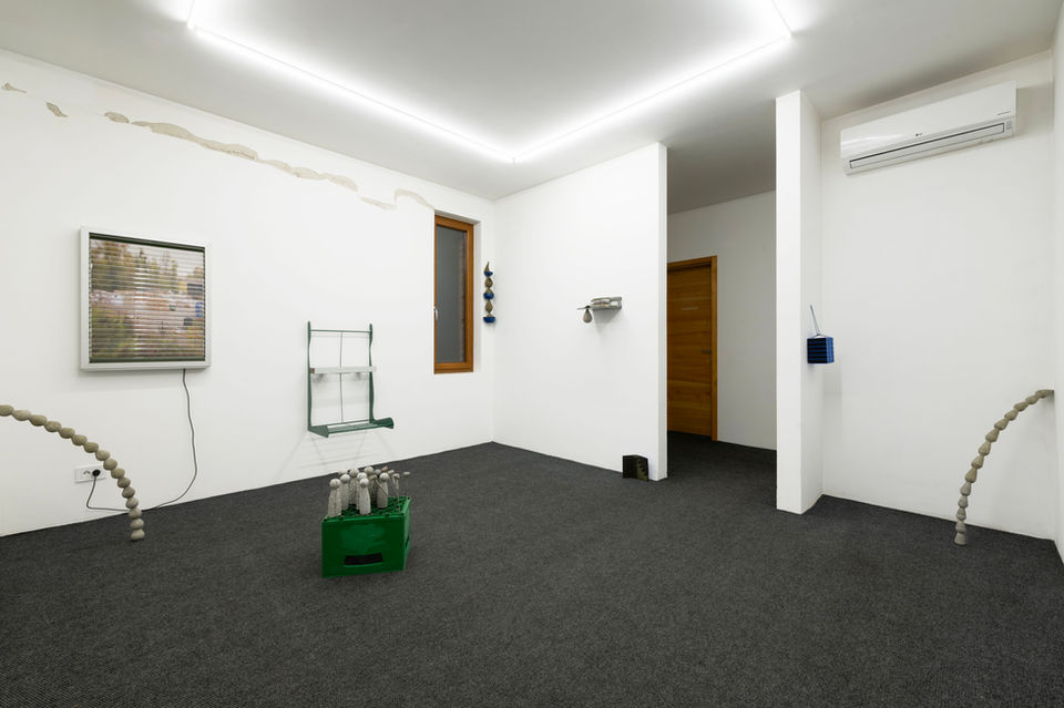 A traditional view on sculpture suggests a monumental dispositif of a skilled hand, which Piotrek challenges through a distinctive application of familiar shapes: droplets, bowling pins, footprints, keyholes. At Autokomanda, the installation plays with the associations evoked by these shapes, creating a dioramic experience in which the viewer is invited to jump between scales and perspectives. This setting of almost-belonging to the scene strongly holds a ghostly presence of time: a paper surrounded by trees from which it is made spins on the shutter blind, accompanied by a pair of keys and a functional digital watch that runs one hour ahead.