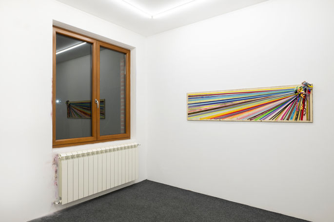Sveta already used make-up on a museum wall before, to write her own name and the title of the show. This time, the logic extends into her use of make-up as a gesture that marks the space, rather than decorating it. The material functions as a tool of presence: a way of insisting on visibility without representation and treating the space as a body that can be shaped as volume – not void. The risk of slipping into abstraction is acknowledged and it stays, deliberately; make-up hovers between control and excess.