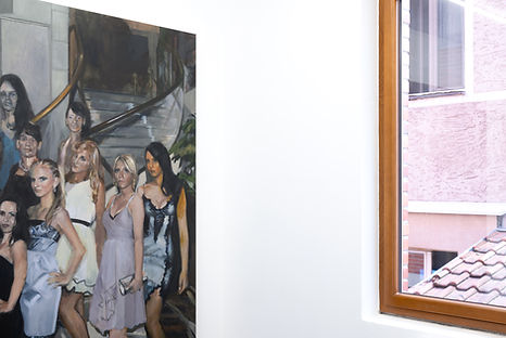 Julija Zaharijević’s Symmetry depicts young women at a prom in Belgrade in the 2000s, their clothes recalling the distinctive codes of that era. Among them stands a member of the Swiss Guard, his uniform unchanged since the 16th century and borrowed from Raphael’s frescoes (visually comical, yet protected by the institution it represents). The painting contrasts the image of youth with the persistence of institutional image, leaving the role of the guard ambiguous among the girls.